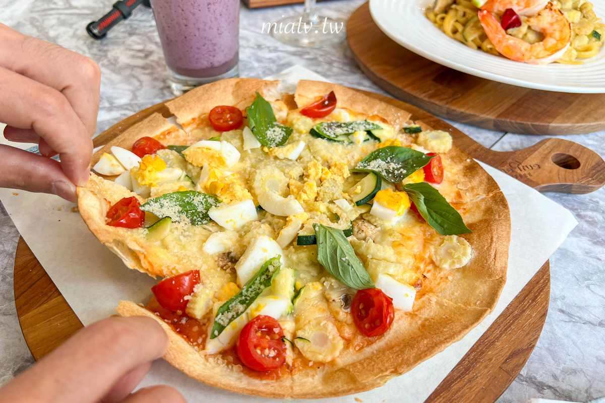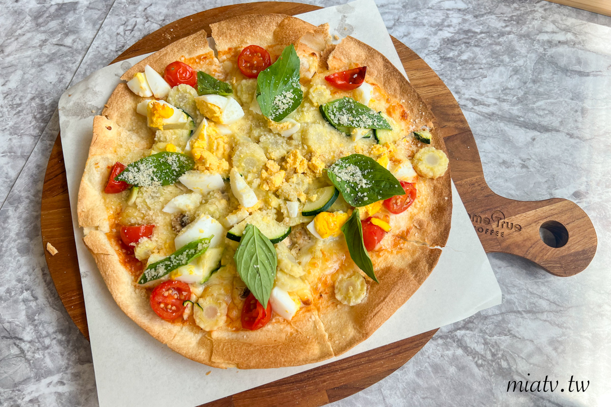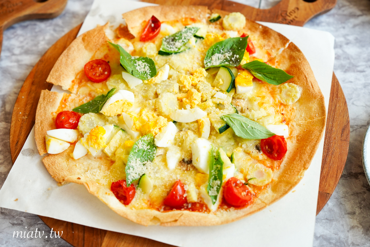 義式鄉村蕃茄薄餅$280元,餅皮酥脆,有小蕃茄、水煮蛋、櫛瓜、玉米筍及羅勒葉,很適合跟朋友一起分食。