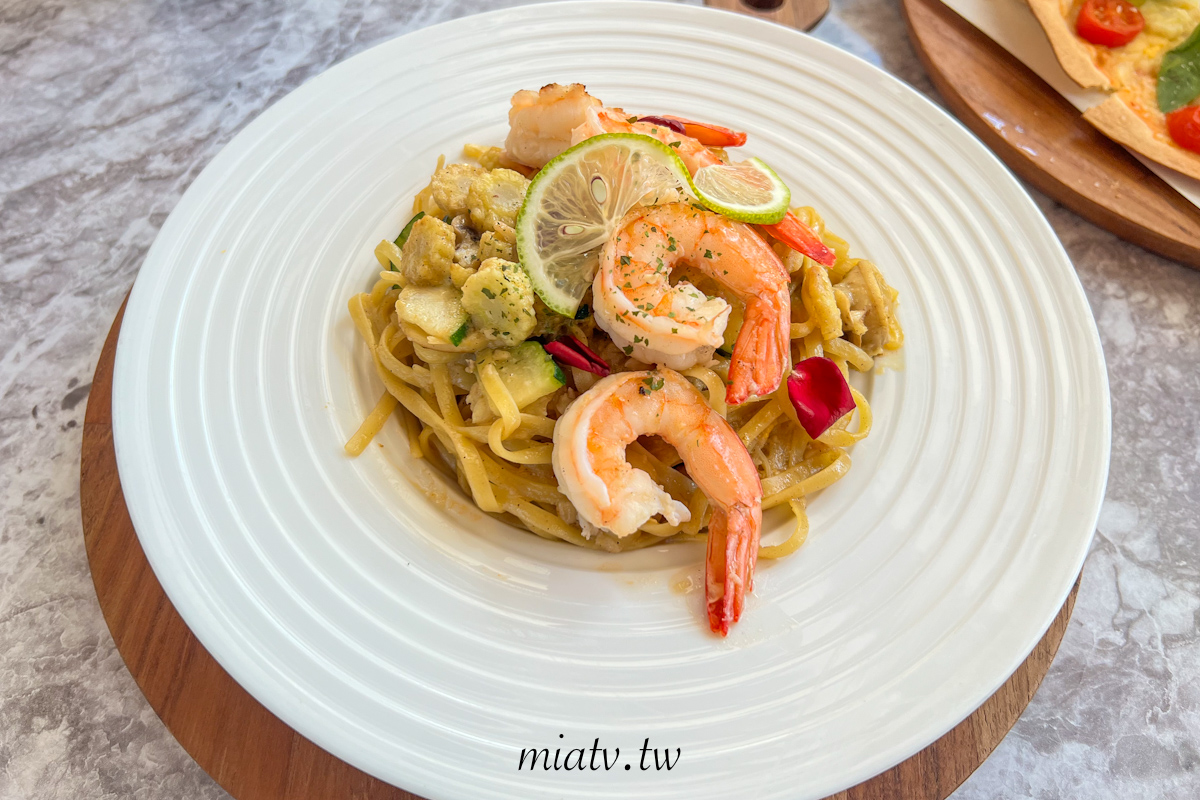 義大利麵上還撒上玫瑰花瓣,顏值很高,有點小可惜是我太愛拍攝美食了,吃的時候有點涼掉,所以醬汁會有蛋黃的顆粒感,另外個人喜歡醬汁多的義大利麵,所以這道覺得還好。
