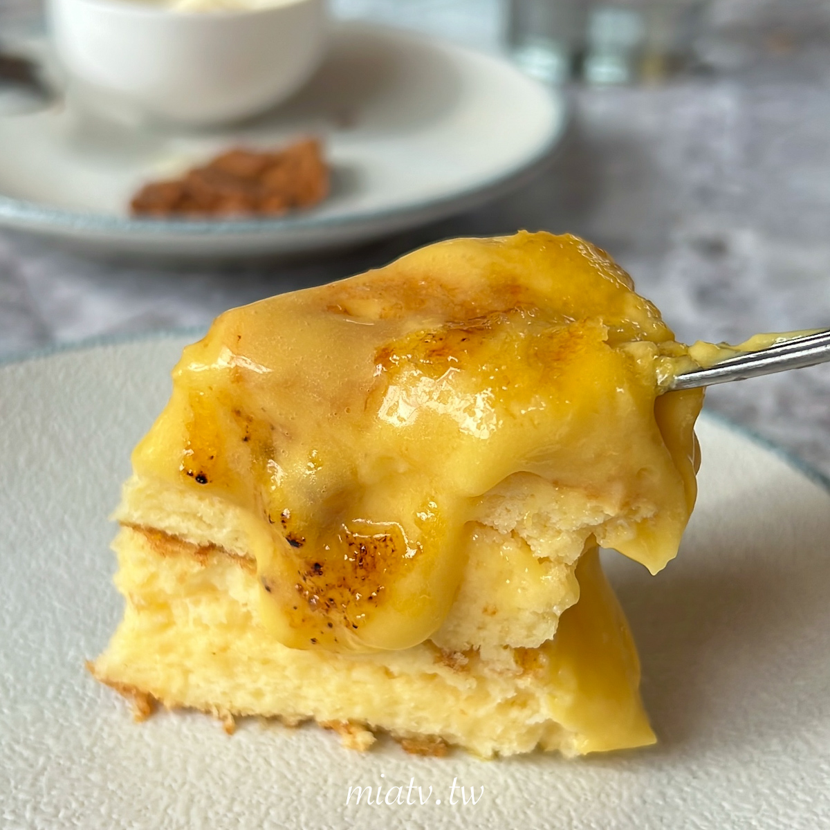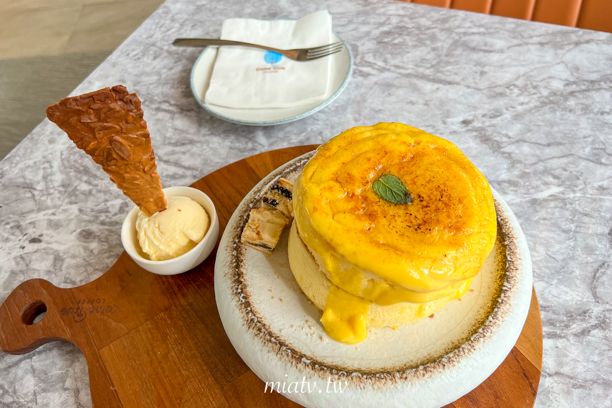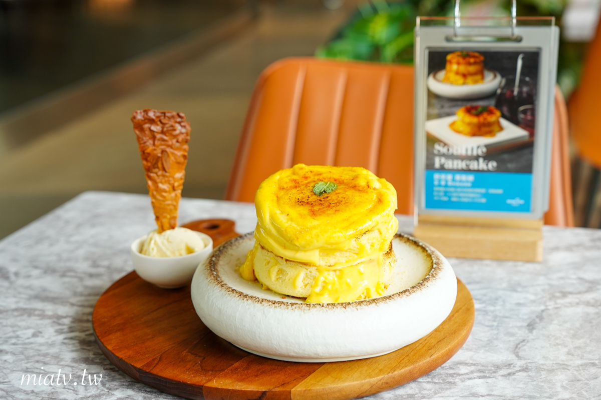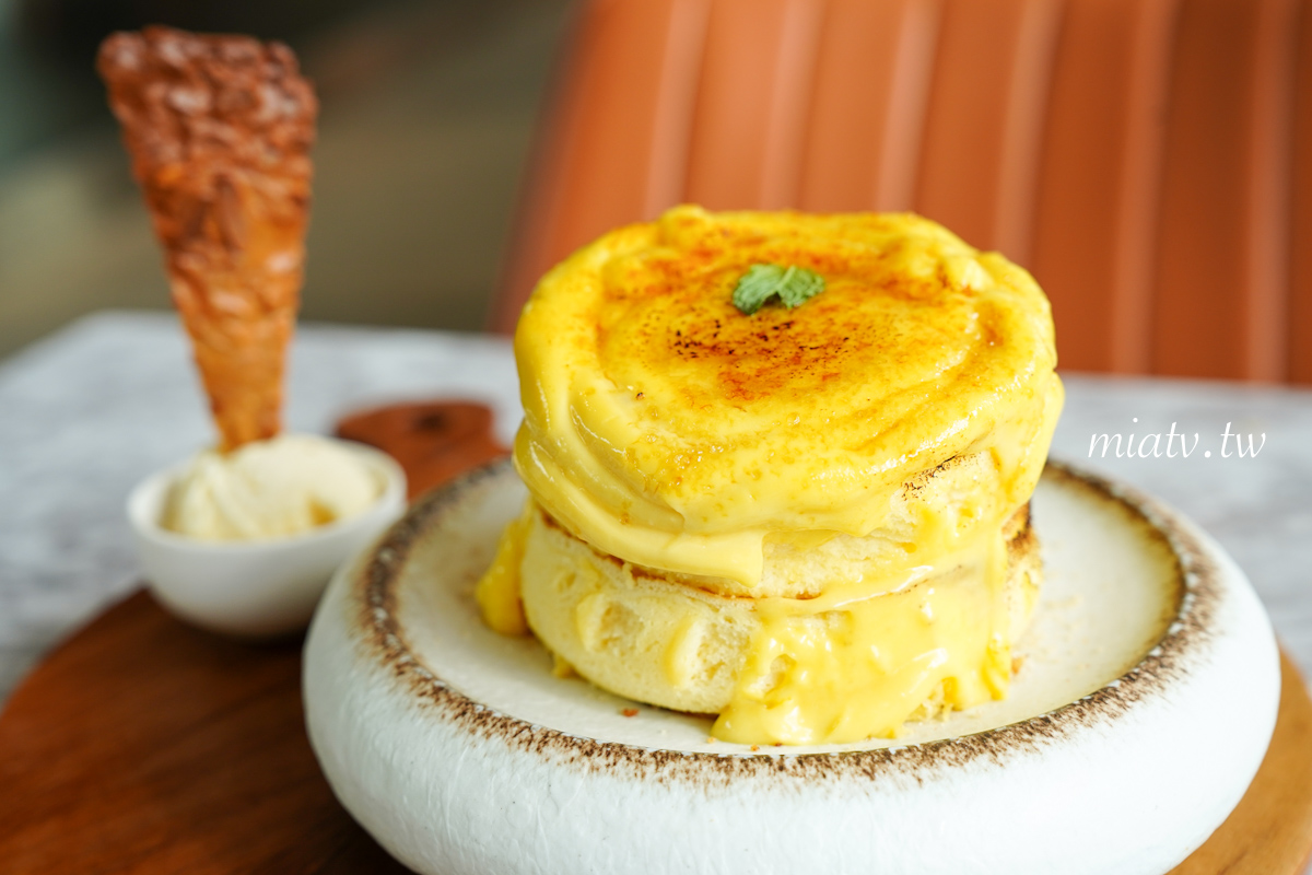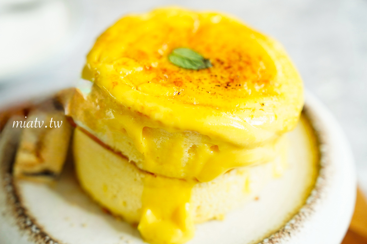 Mia個人比較愛軟綿入口即化的口感,這份熔岩焦香布蕾舒芙蕾厚鬆餅口感則是相當扎實,非常厚,吃起來偏向傳統蛋糕、古早味蛋糕的綿密感,但還不到入口即化。