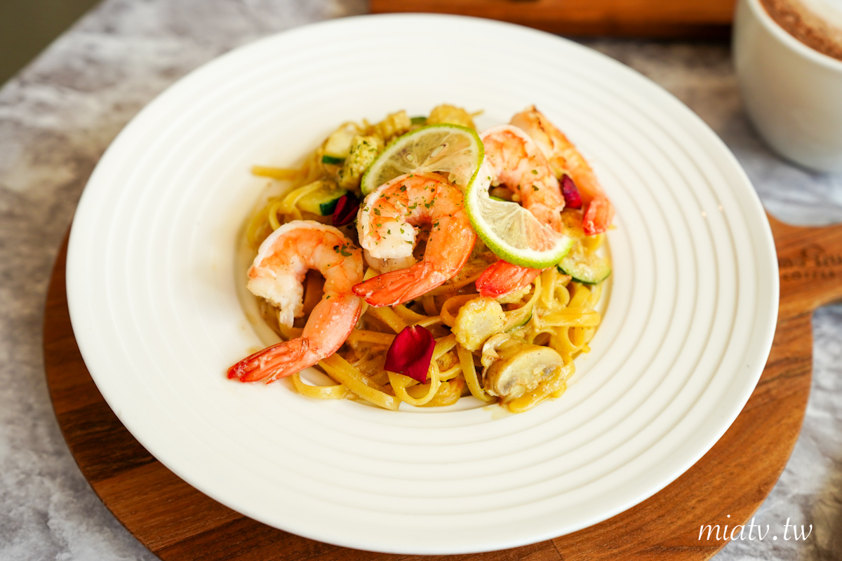 青檸蒜香鮮蝦義大利麵$380元,這道為成真咖啡台北松菸店的是熱銷餐點,有新鮮白蝦、蘑菇、櫛瓜跟玉米筍等搭配蒜香奶油醬炒,加生蛋黃攪拌攪拌後,加入檸檬汁平衡豐富風味。
