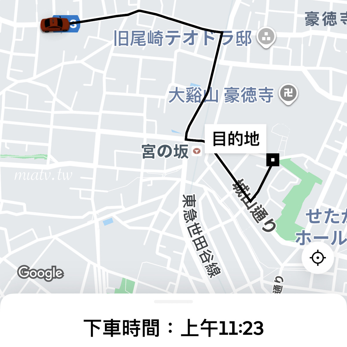 豪德寺站有計程車排班區,但非常難等,至少需要等10分鐘以上才能搭乘,所以分秒必爭的我們改搭Uber,上午11點18分上車,大約11點23分下車,真的很省時間。來日本自由行,走不動或趕時間的時候趕快叫Uber就對了!