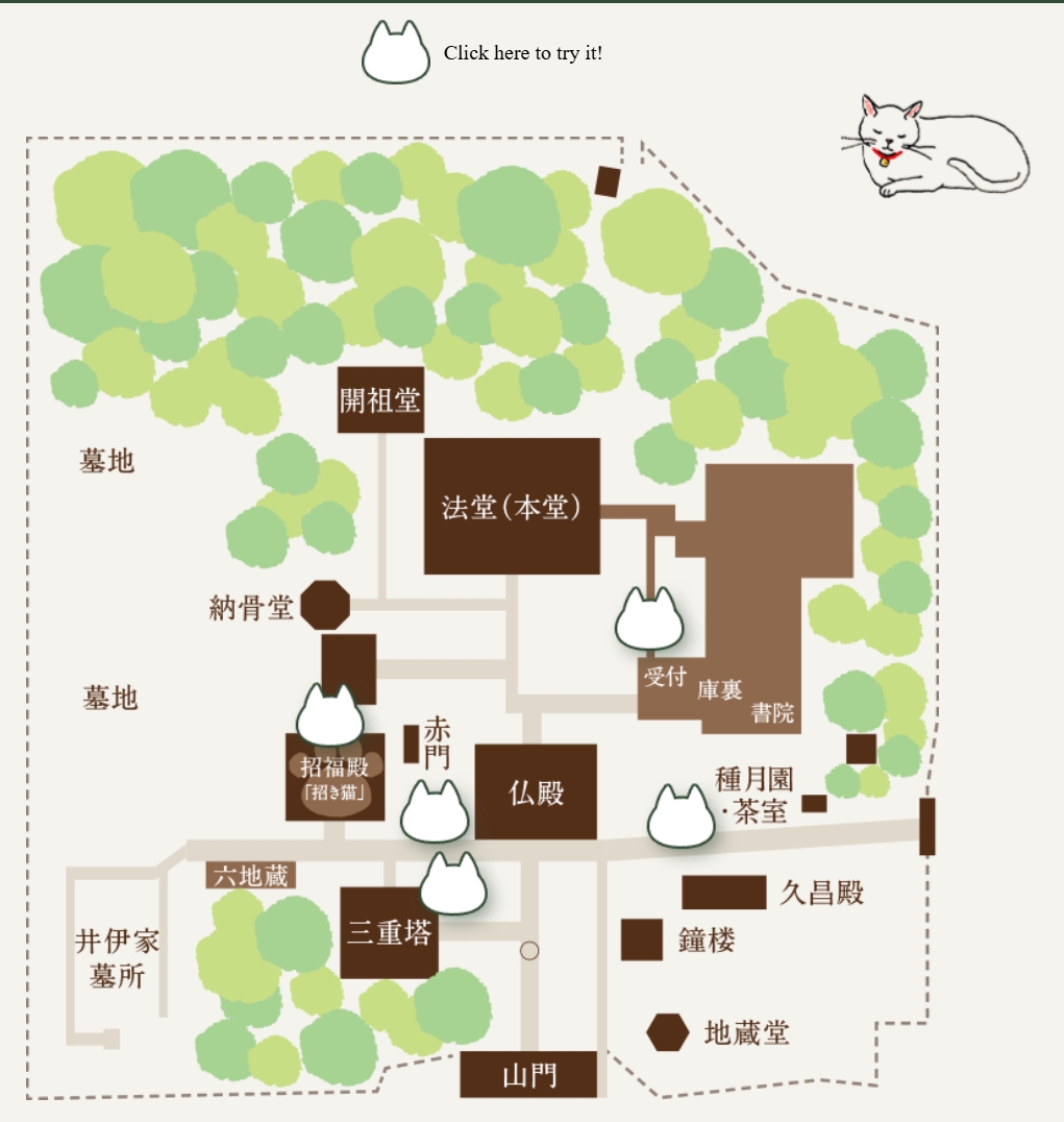 傳說江戶時代的大名井伊直孝(1590年~1659年)曾被寺廟飼養的貓咪引導,順利躲過了一場雷雨,從此這隻帶來幸福的招財貓便成為寺廟的守護象徵。