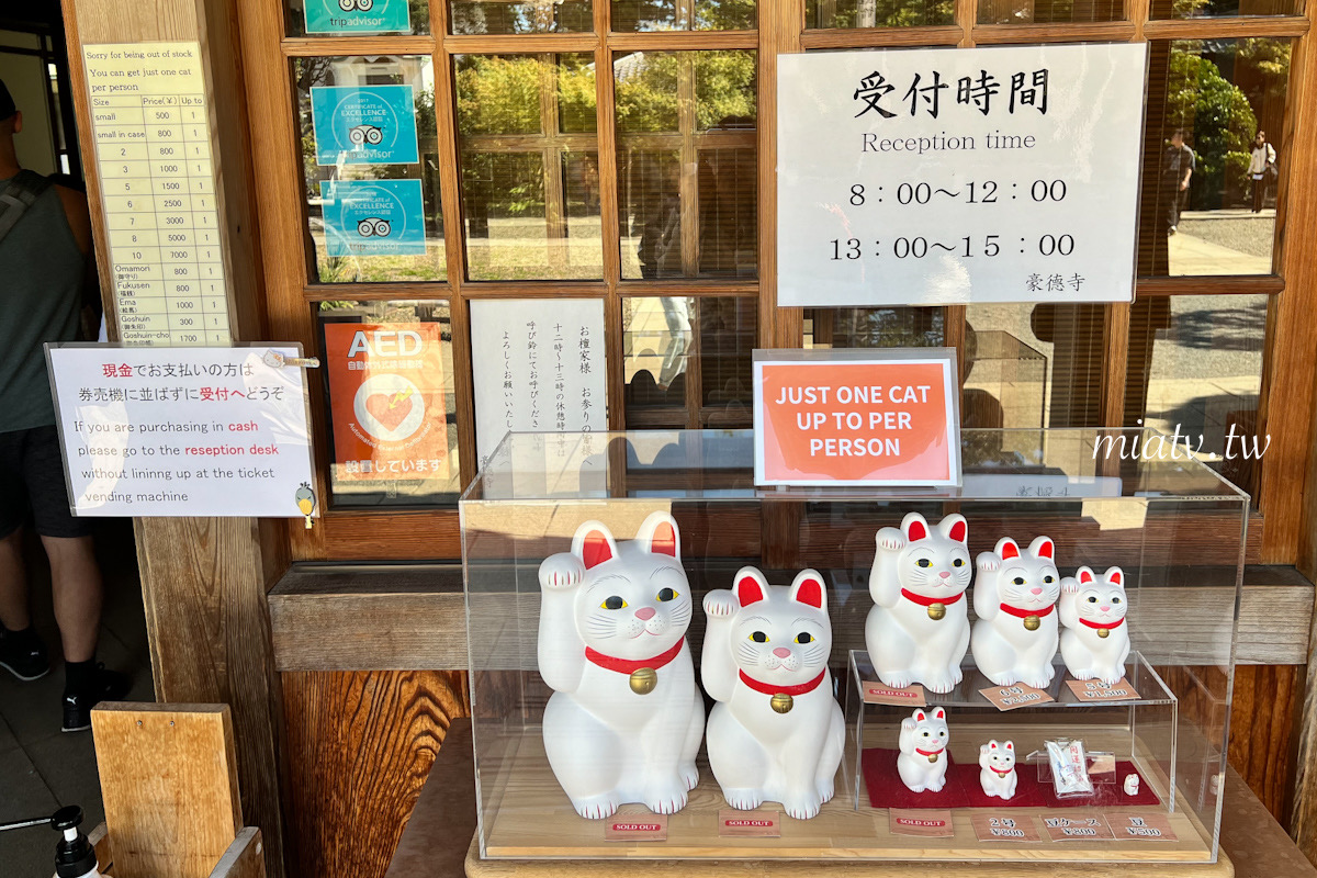 日本東京有2個最著名「招財貓發源地」,分別是豪得寺(Gotokuji Temple)與今戶神社(Imado Shrine)。其中這座位於東京世田谷區的豪德寺以可愛「千隻招財貓」景象脫穎而出,於是2025年的東京自由行,令我非常嚮往來此拍照,馬上納入行程中。寧靜寺院內不僅有陳列整齊的大小招財貓,更有販售9種尺寸(每人限購1隻),尤其是楓葉季來訪的話,可以拍到更有意境的招財貓與楓葉合影。推薦大家安排輕鬆的東京世田谷區半日遊,從錦系町搭電車前往大約60分鐘,當天我們只快閃半小時,趕在中午12點關門前順利買到2隻招財貓回家,希望能提高年收入及年終獎金呀!至於是否靈驗,大家可以也帶一隻招財貓回家試試看喔!