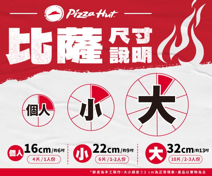 - 個人比薩:約6吋,直徑16cm,切4片可供1人享用。